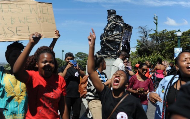 Mthunzi Mthimkhulu, a technology consultant and former student at the University of Cape Town, stood Saturday near the Rhodes statue, which had been wrapped in black garbage bags by protesters. Obscene graffiti covered the pedestal.
