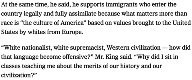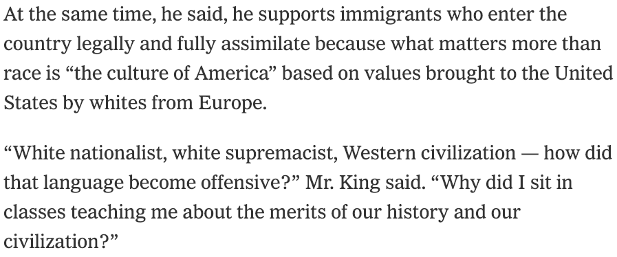 But in an interview with The Times published last week, Mr. King said: “White nationalist, white supremacist, Western civilization — how did that language become offensive?”