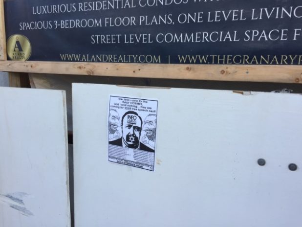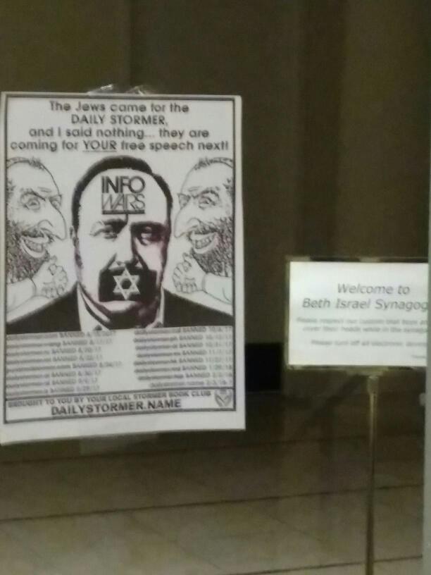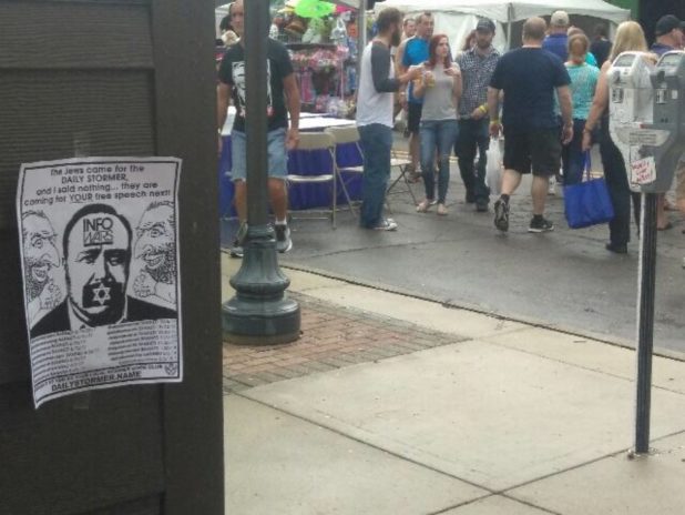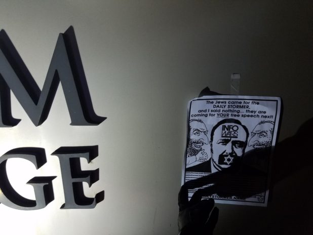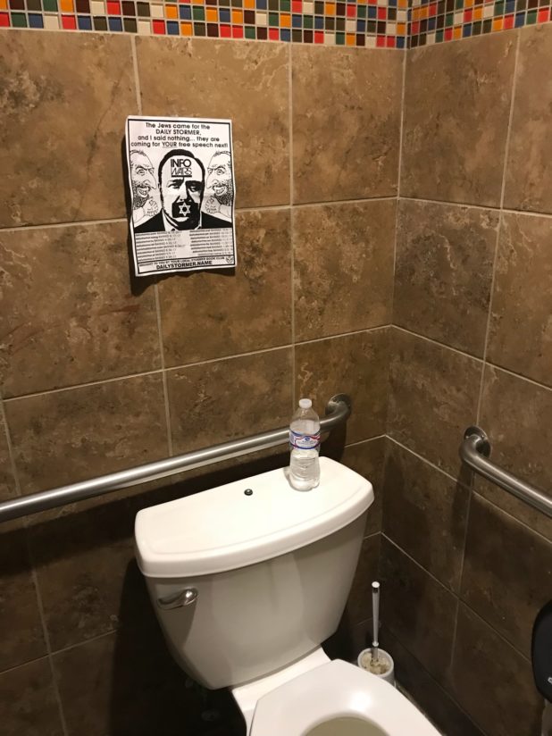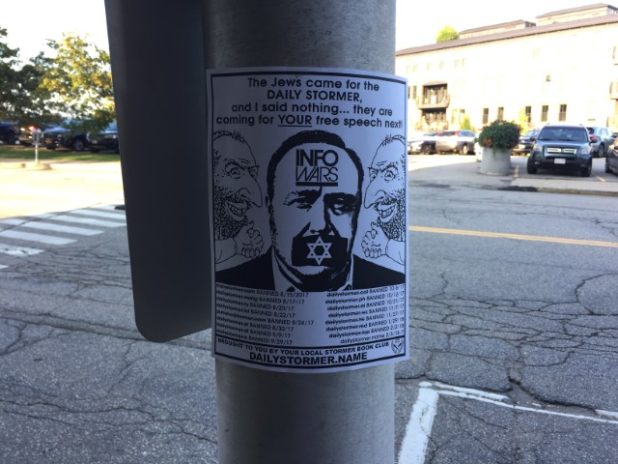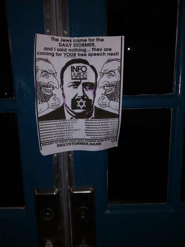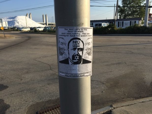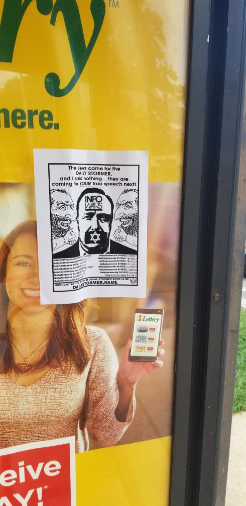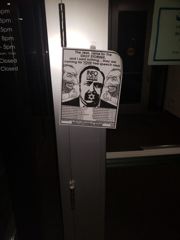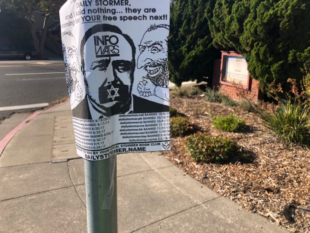 The flyers blamed Jewish people for the fact that The Daily Stormer, a virulently anti-Semitic publication, was booted from a succession of website domains since August 2017. “They are coming for your free speech next,” the flyers said.