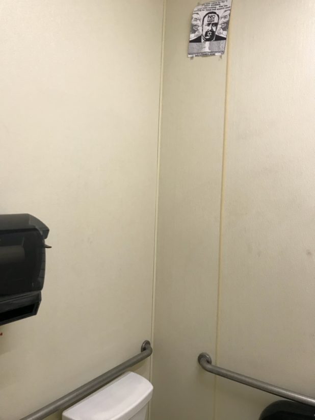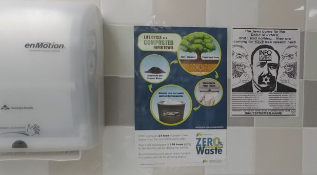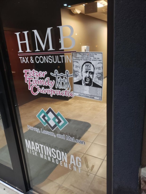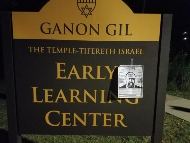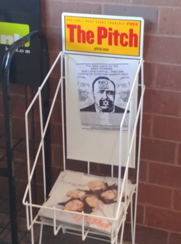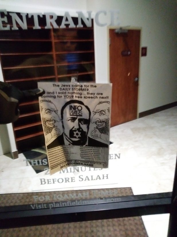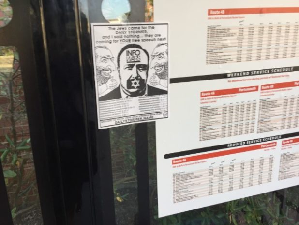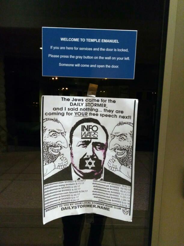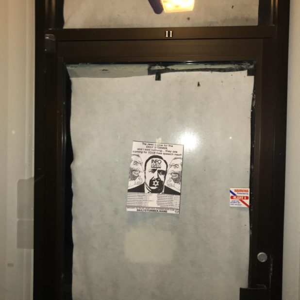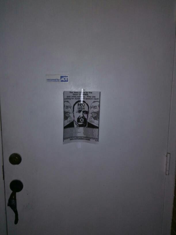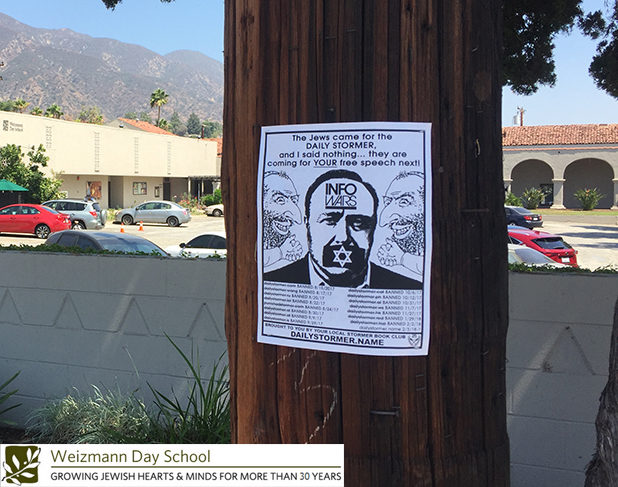 The flyers blamed Jewish people for the fact that The Daily Stormer, a virulently anti-Semitic publication, was booted from a succession of website domains since August 2017. “They are coming for your free speech next,” the flyers said.