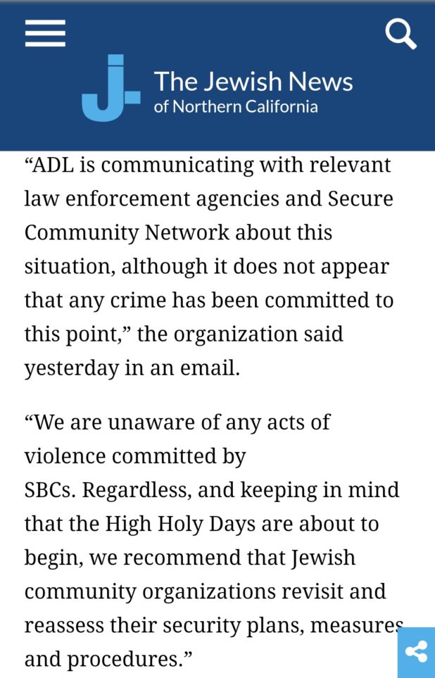 The Anti-Defamation League issued a community security advisory about the fliers on Friday, J, The Jewish News of Northern California, reported.