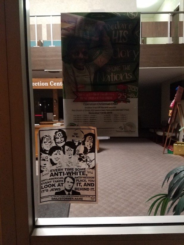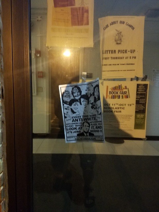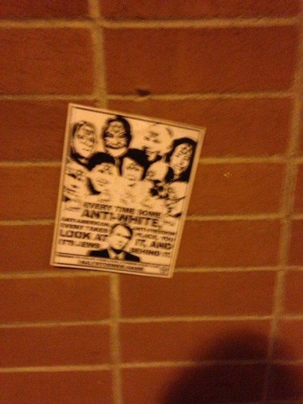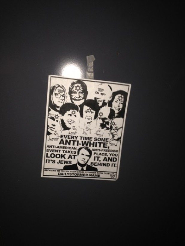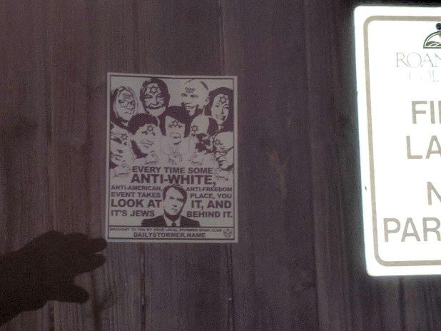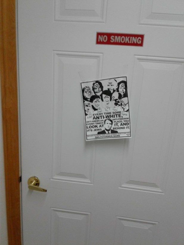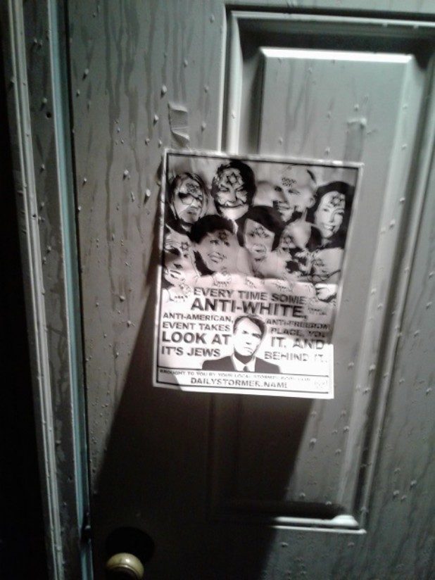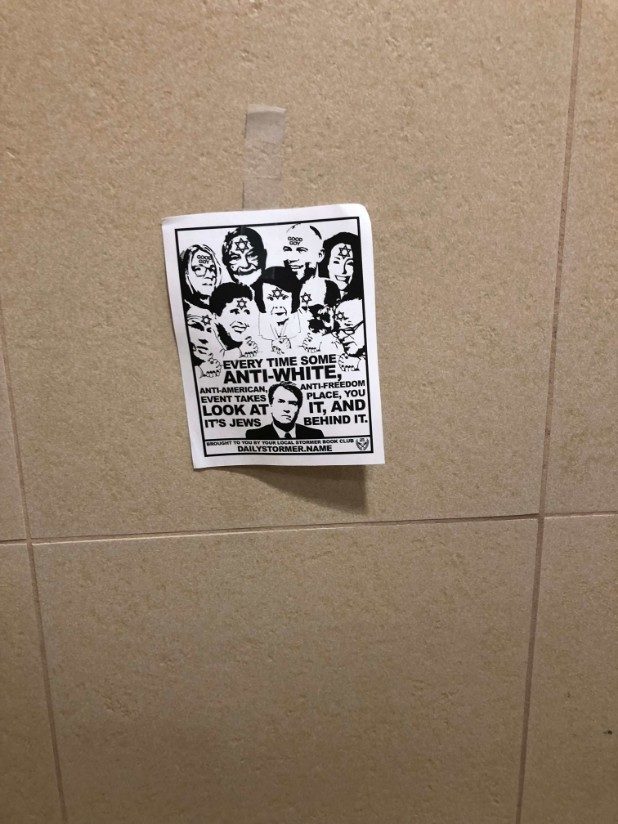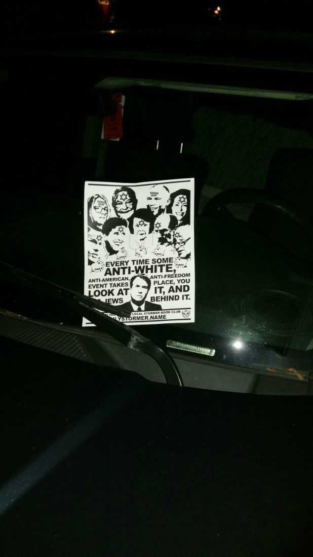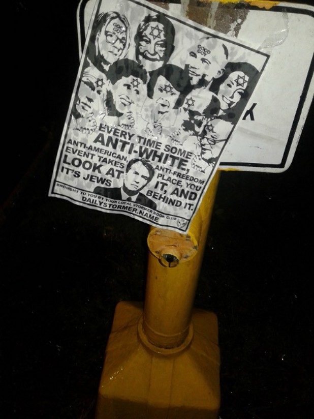 The bottom of the flyer stated it came from the local Stormer Book Club, which are small organizations that support The Daily Stormer, a neo-Nazi website.