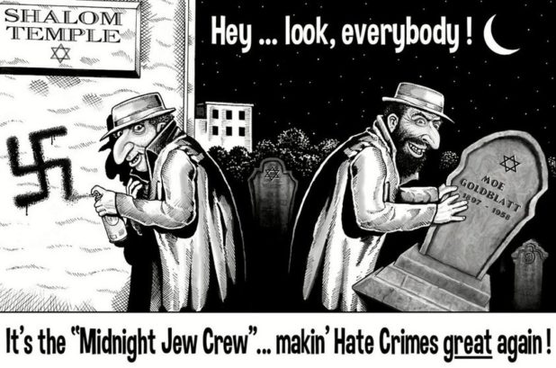 Needless to say, hand-rubbing immediately turned to hand-wringing, and tortured cries of “OY VEY! OY GEVALT!” were heard echoing across the fruited plain, and many fingers were pointed while exclaiming “anti-Semitic!”