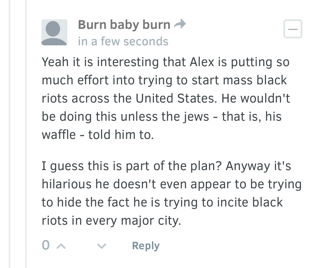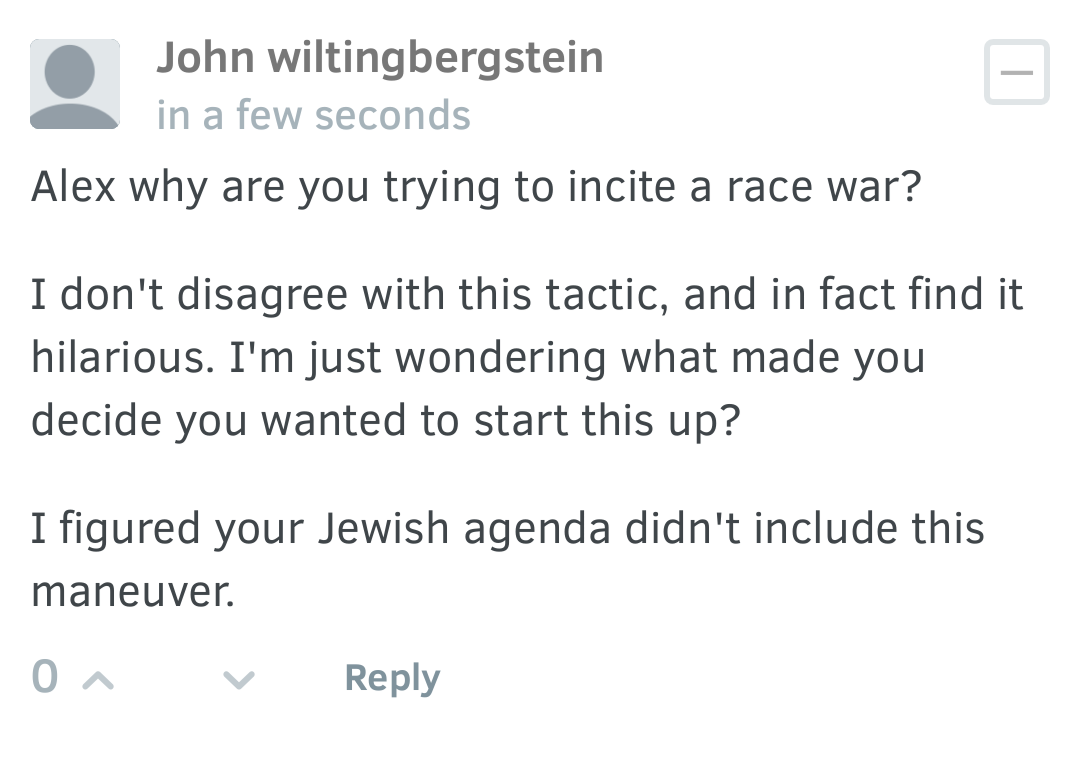 Also, the word “Jew” is not yet banned, but if we can get him to ban that word, we will be in incredibly good shape. People will take notice of that on a large scale. I believe he will shut down the entire comments section before banning the word Jew, but I am uncertain. I am also uncertain if he will have a complete psychological breakdown before or after making the decision to totally shut down comments.