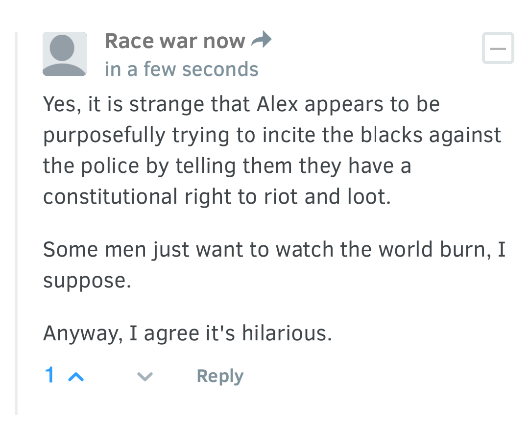 He can’t resist attacking us and calling us racists for desiring a future for White children and being fed up with the behavior of the blacks. And his largely White and Christian audience will catch on to this, especially when he is literally saying cops are oppressing a violent black mob of rioting looters and that anyone who questions this position is a “primitive racist dumbass.”