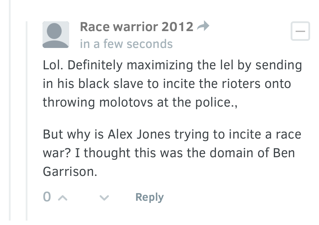He has claimed that we – and/or the mysterious government agents who post without proxies on infowars.com from the Pentagon – are accusing him of trying to incite riots and start a race war. I’m assuming some of the Stormers hit on this and went with it, or maybe he just made it up in his mind, but I find it hilarious.