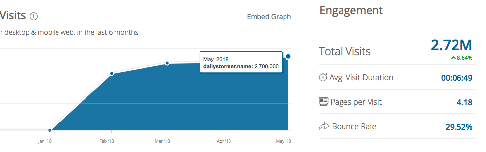 In contrast, Daily Stormer has millions of monthly uniques. You can verify this with third parties. Similarweb plots last month’s unique viewers at 2.7 million: