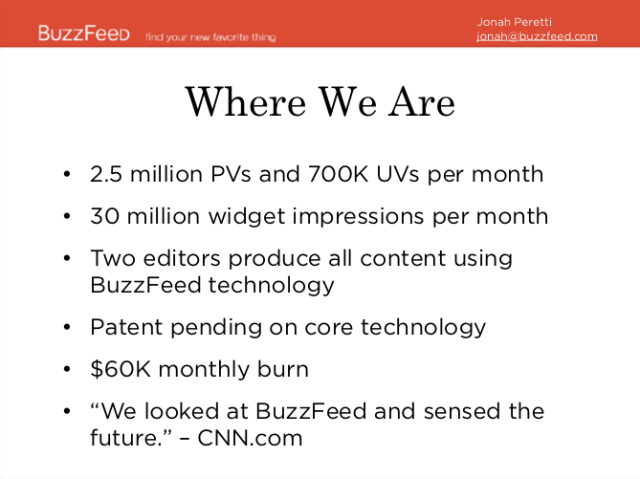 Buzzfeed in 2008 asked for millions of dollars on the basis of 700k monthly unique viewers– and they were losing $60k a month. Venture capitalists said “those numbers are impressive” and gave them the millions they asked for.