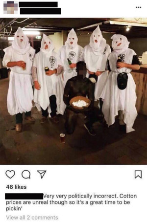In recent years, the college has introduced a strict social media policy, but earlier images taken during a 2015 orientation week college quiz night depict teams of students dressed as racial stereotypes, including Asian and Jewish caricatures.