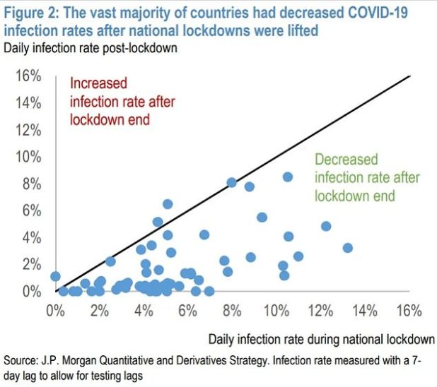 The JP Morgan report includes graphs showing that ‘the vast majority of countries had decreased infection rates’ after lockdowns were lifted.