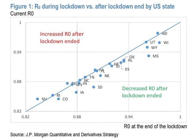 The report also shows many US states including Alabama, Wisconsin and Colorado enjoying lower R rates after lockdown measures were lifted.