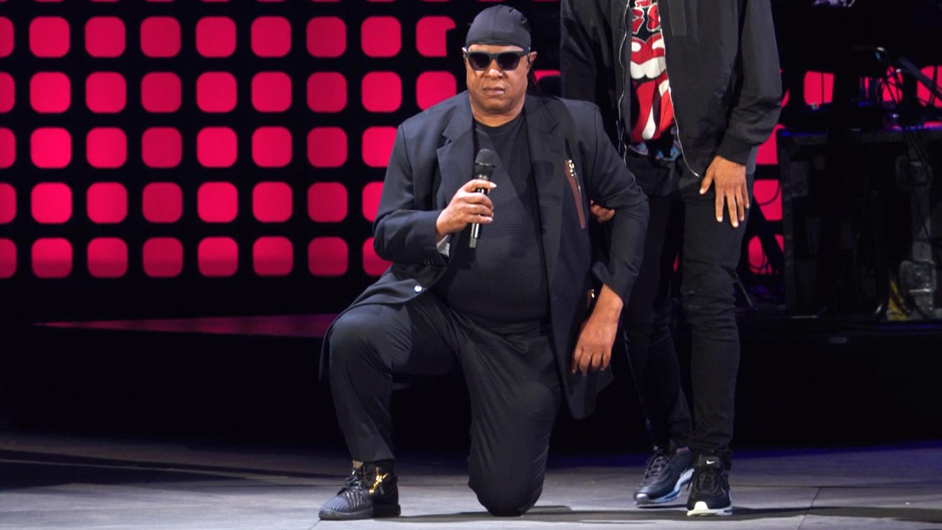 Wonder did not mention the president by name, but his decision to take a knee on stage came the day after Trump used profane language to attack the national anthem protests being staged by National Football League players.