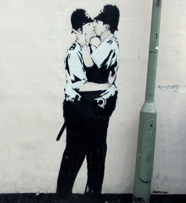 Perhaps the most famous contemporary graffiti artist is Banksy. True to his ilk, Banksy – who remains anonymous to this day, and could even be a group of people – fashions himself as a “subversive” who specializes in “hard-hitting” murals. You know, the usual spiel about holding a mirror to society and forcing it to confront its prejudices.