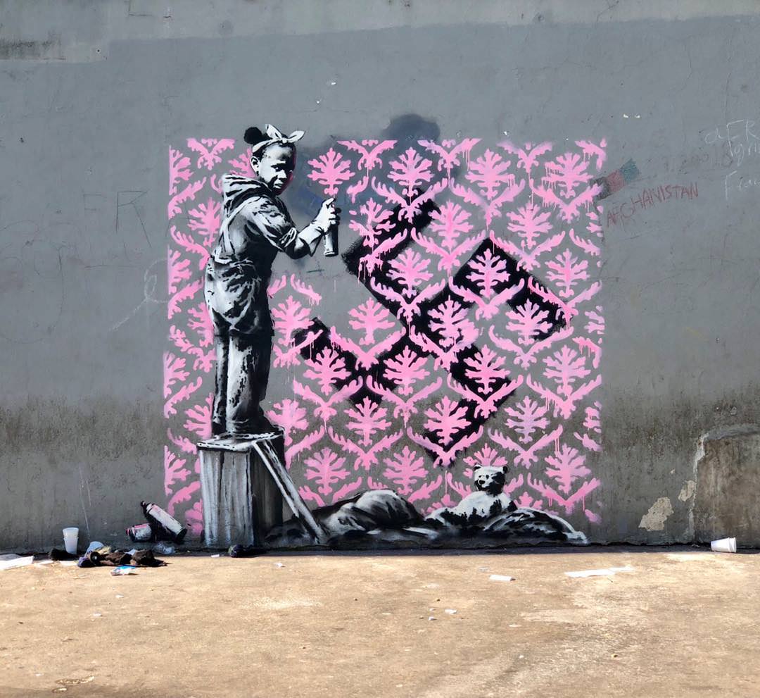 The wallpaper stencil was used in a previous Banksy piece called ‘Go Flock Yourself’, which was shown at the 2009 Banksy versus Bristol Museum exposition.