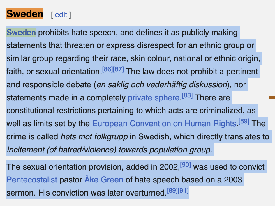 However, Sweden is not a country with freedom of speech. It’s a country with hate speech laws, which explicitly say you can’t “incite hatred against a group.”
