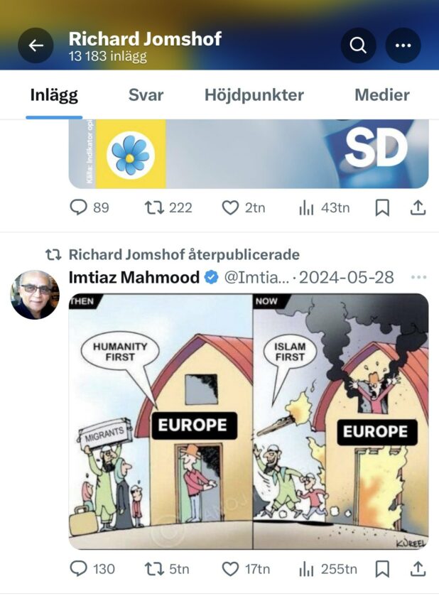 It was in May of this year that Jomshof retweeted two cartoons posted by Imtiaz Mahmood, whose bio on X describes him as “Outspoken atheist, anti-theist, freethinker, an unapologetic and staunch heretic. I refuse NOT to mock all religions.” The cartoons, by Indian satirist Manoj Kureel, show Muslim immigrants being welcomed by Western Europeans and then violently taking over—in one case setting fire to house with the label “Europe”; in the other, pushing a European man out of a boat while keeping the women in it.