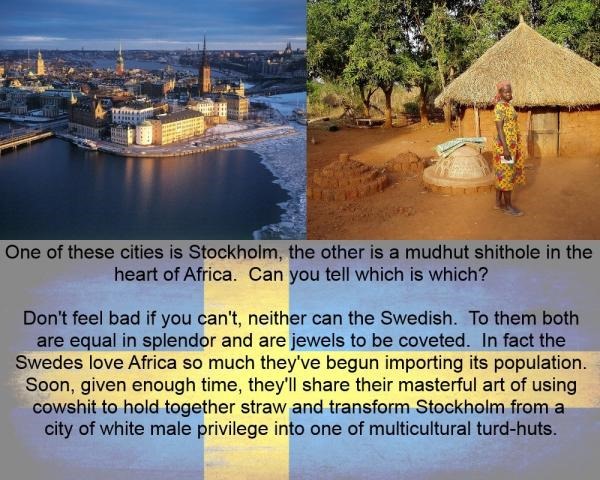 Which formerly prosperous, spiritually healthy and racially homogenous European nation will be the first to be unceremoniously dropped into the kosher grave of “multiculturalism?” Will it be the United Kaliphate, land of mosques, cameras and knife-control laws? What about El-France with her burning cars, sharia no-go zones and weak and effeminate support for dead cartoonists? Maybe Germanistan, a humiliated nation of thousands of holohoax memorials, regular payments to the jew devil for imaginary sins and mudslime invasion? All of these are good answers, but none are correct. Swedenistan, land of rape apes and gutless White cuckolds is clearly the current the leader in the race to third world collapse.
