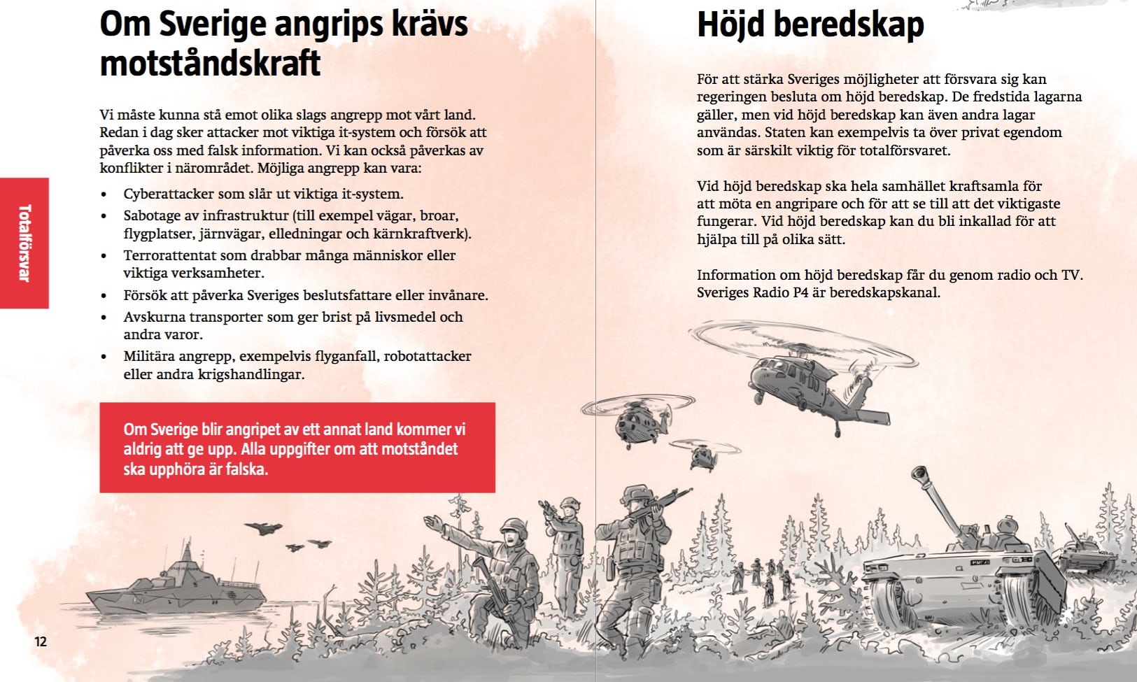 Om krisen eller kriget kommer (If crisis or war comes) explains how people can secure basic needs such as food, water and heat, what warning signals mean, where to find bomb shelters and how to contribute to Sweden’s “total defence”.