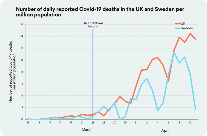 Fewer people per capita have died “of coronavirus” in Sweden than in the United Kingdom, despite the latter’s enforcement of a lockdown.