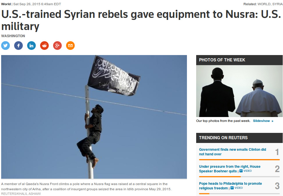 The rebels surrendered six pick-up trucks and some ammunition, or about one-quarter of their issued equipment, to a suspected Nusra intermediary on Sept. 21-22 in exchange for safe passage, said Colonel Patrick Ryder, a spokesman for U.S. Central Command, in a statement.