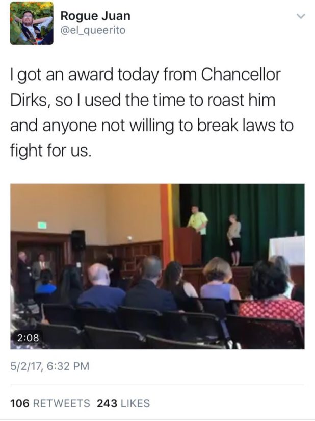 According to a post on his now private Twitter account, Prieto was given some kind of award by a college official. Instead of being grateful that this wasn’t some set-up where ICE was waiting around the corner to give him a nice tune-up and toss him into the back of a van, the entitled bone-smoking beaner used it as an opportunity to whine about how the college wasn’t doing enough for his fellow not-supposed-to-be-heres, which is in direct contradiction to an op-ed he wrote for the New York Times in which he admitted that “the University of California, Berkeley, has some of the best resources in the country for undocumented students like me — in the form of financial and legal aid, for example.”