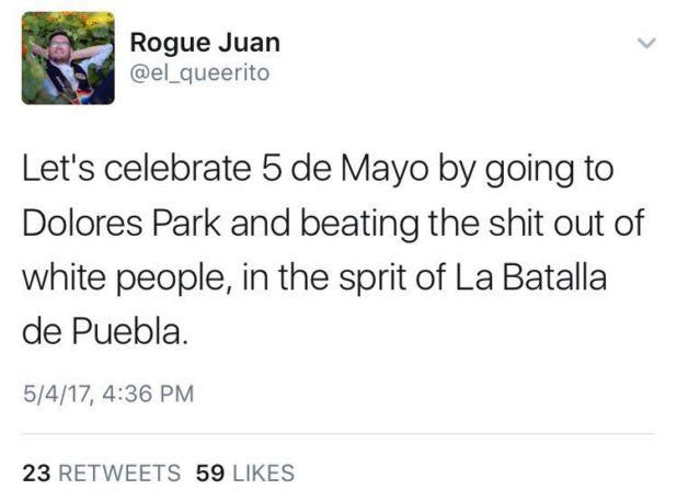 As if that’s wasn’t bad enough, Prieto is an anti-white communist on top of it who openly calls for violence, both on Twitter and in his articles. Back in February, this malevolent mestizo maricon penned an article praising antifa for attacking the attendees of the Milo Yidopolis speech that was planned at Berkeley and celebrating the property damage they committed because it made him feel safe.