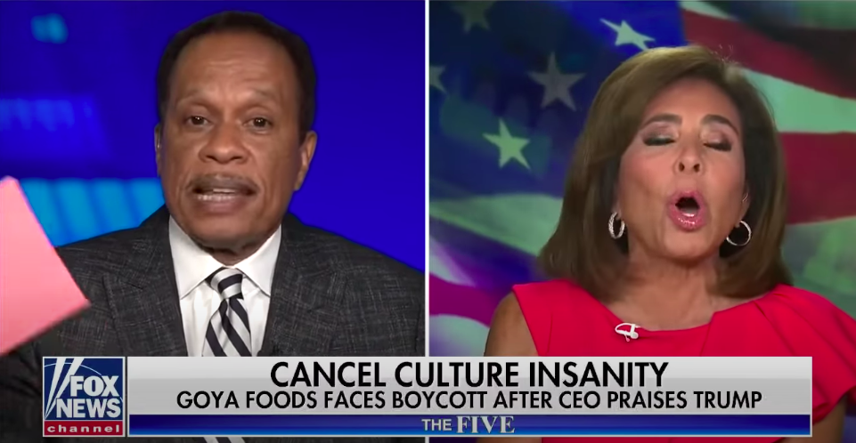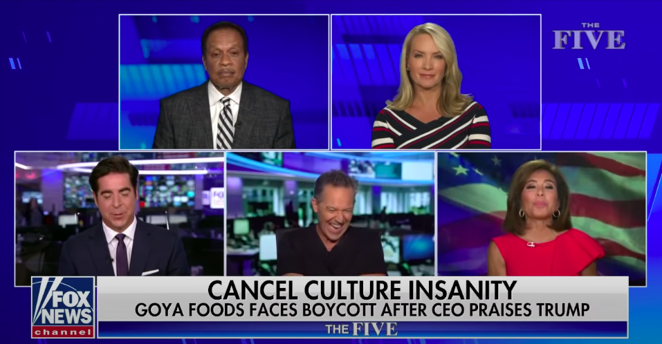 She then went to Greg Guttfeld, who looks 20 years older than he did last year. He broke into a berserk diatribe about cancel culture and how someone needs to “make a company” that doxes the people who are doing boycotts of Goya foods or getting people fired so that people can spam-call their employers.