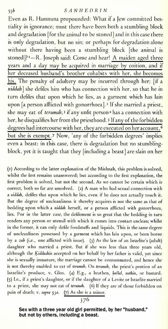 The Talmud defends these strict measures as necessary to forestall the possibility of a Gentile child bride rebelling against Judaism and spending the damages awarded to her as a heathen – an unthinkable blasphemy! But the rights of the little girl were really of no great consequence, for, “When a grown-up man has intercourse with a little girl it is nothing, for when the girl is less than this (three years and a day) it is as if one put the finger into the eye.” The footnote says that as “tears come to the eye again and again, so does virginity come back to the little girl under three years.” 11