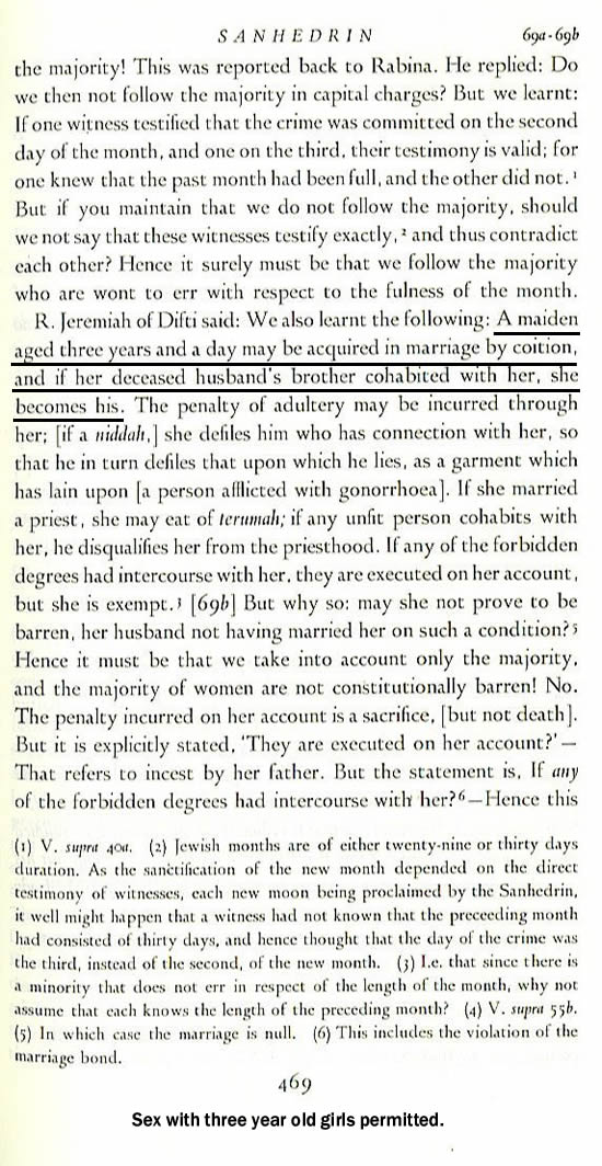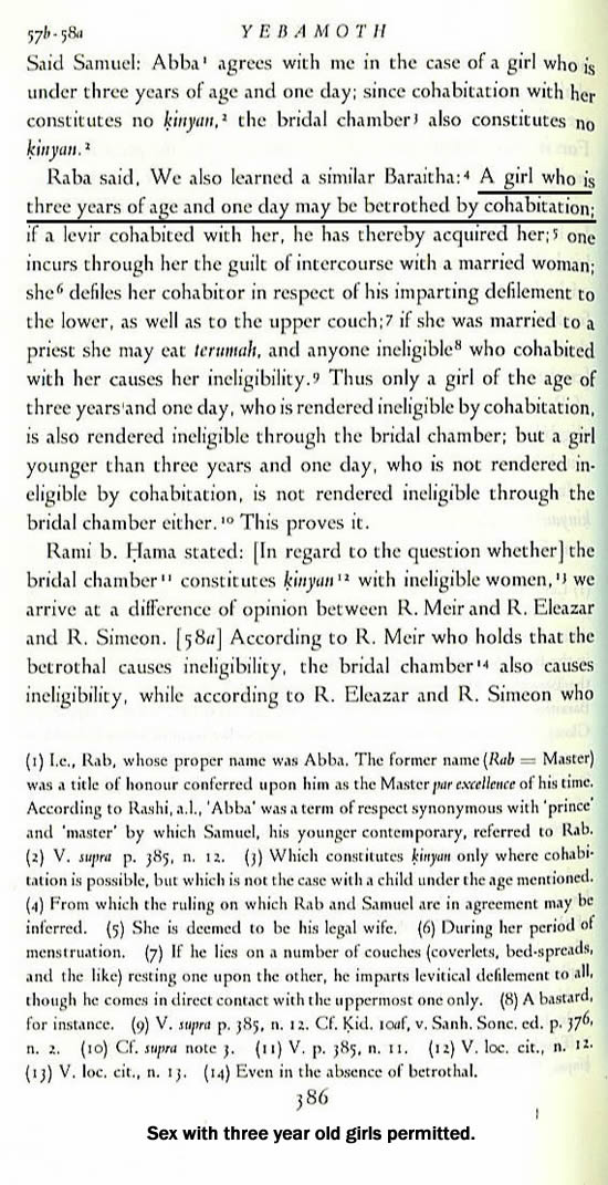 Because the Talmudic authorities who sanction pedophilia are so renowned, and because pedophilia as “halakah” is so explicitly emphasized, not even the translators of the Soncino edition of the Talmud (1936) dared insert a footnote suggesting the slightest criticism. They only comment: “Marriage, of course, was then at a far earlier age than now.” 3