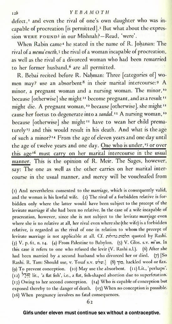In contrast to Simeon ben Yohai’s dictum that sex with a little girl is permitted under the age of three years, the general teaching of the Talmud is that the rabbi must wait until a day after her third birthday. She could be taken in marriage simply by the act of rape.