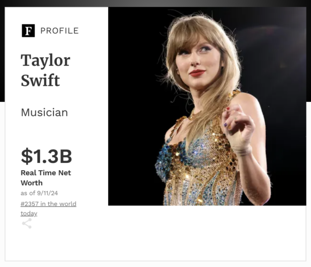 Elvis died with a total estate of $7 million. He was maxing everything out, living life hard. Forbes says Taylor Swift has $1.3 billion.