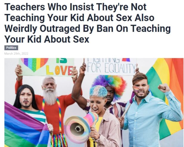 Also – this would be allowed in Florida. At 11, kids are in 4th/5th grade, and the Ron DeSantis bill only banned teaching gay sex to kids in third grade or below. I have no idea why he made 4th grade the limit for teaching kids to give gay blowjobs, but that is what he did – and it did have the special benefit of demonstrating that homosexuals want to indoctrinate very small children into their cult.