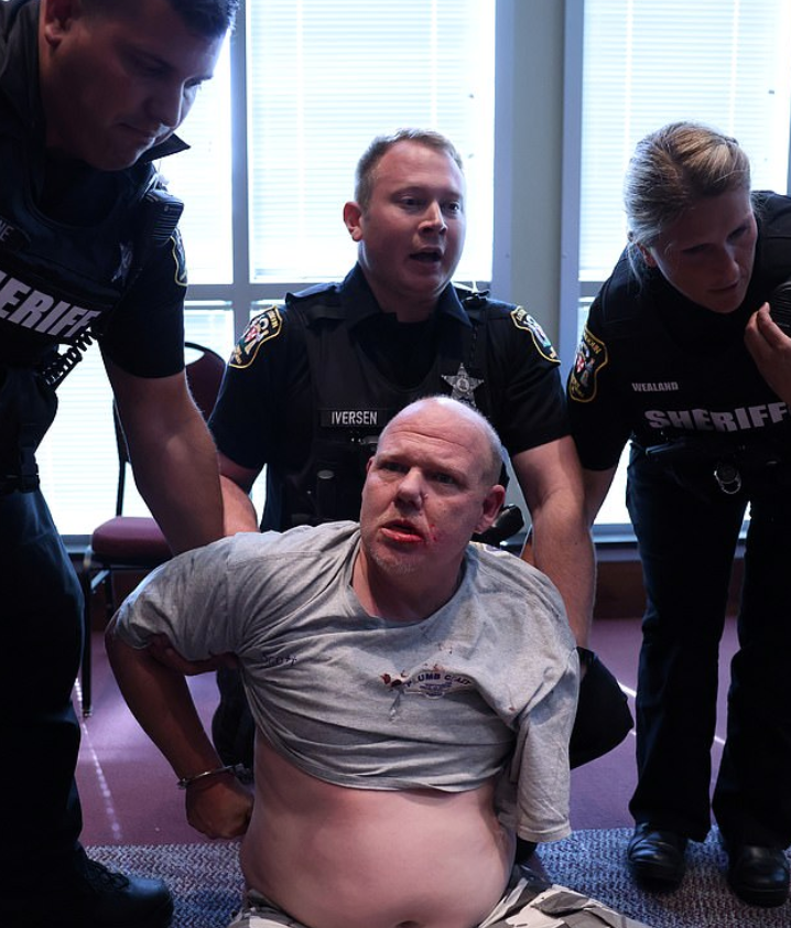The activist, identified as Benjamin Hernandez with the liberal-leaning group Indivisible Houston, yells as security pushes him out of the eatery.