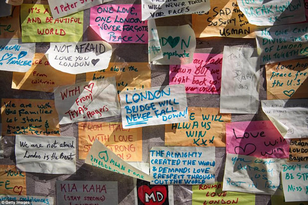 The notes, bearing messages such as ‘London Bridge will never fall down’ and ‘Not afraid, love you London’, lined a wall at the south end of London Bridge.