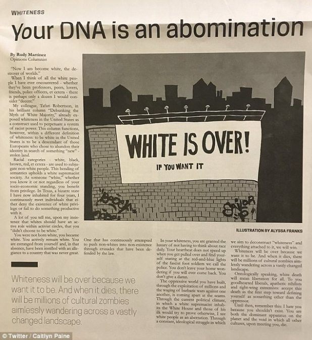 The entire campus of Texas State University is in uproar over an uppity beaner daring to attack the White race in an op-ed published by the school newspaper. Some were presumably also offended that a brown person was even allowed to attend the college.