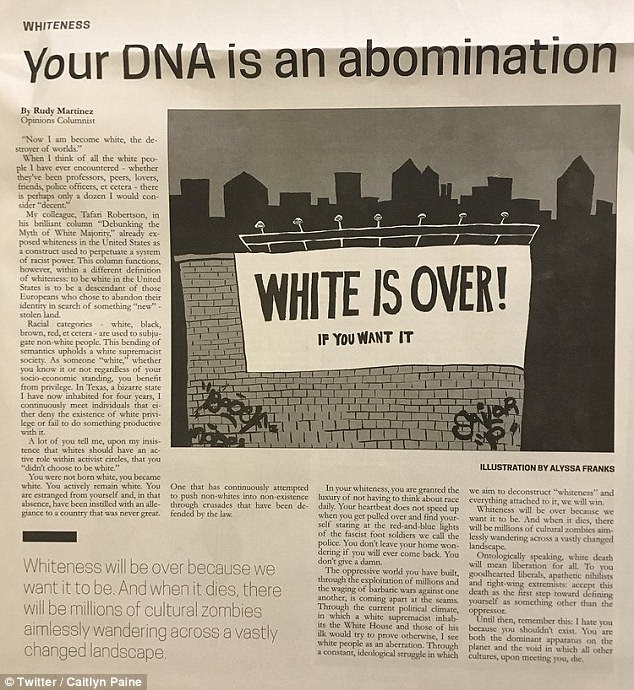 The column, written by Rudy Martinez, was published on Nov. 28 and was titled “Your DNA is an Abomination.” It received massive backlash from readers, who said the writer expressed racist ideals.