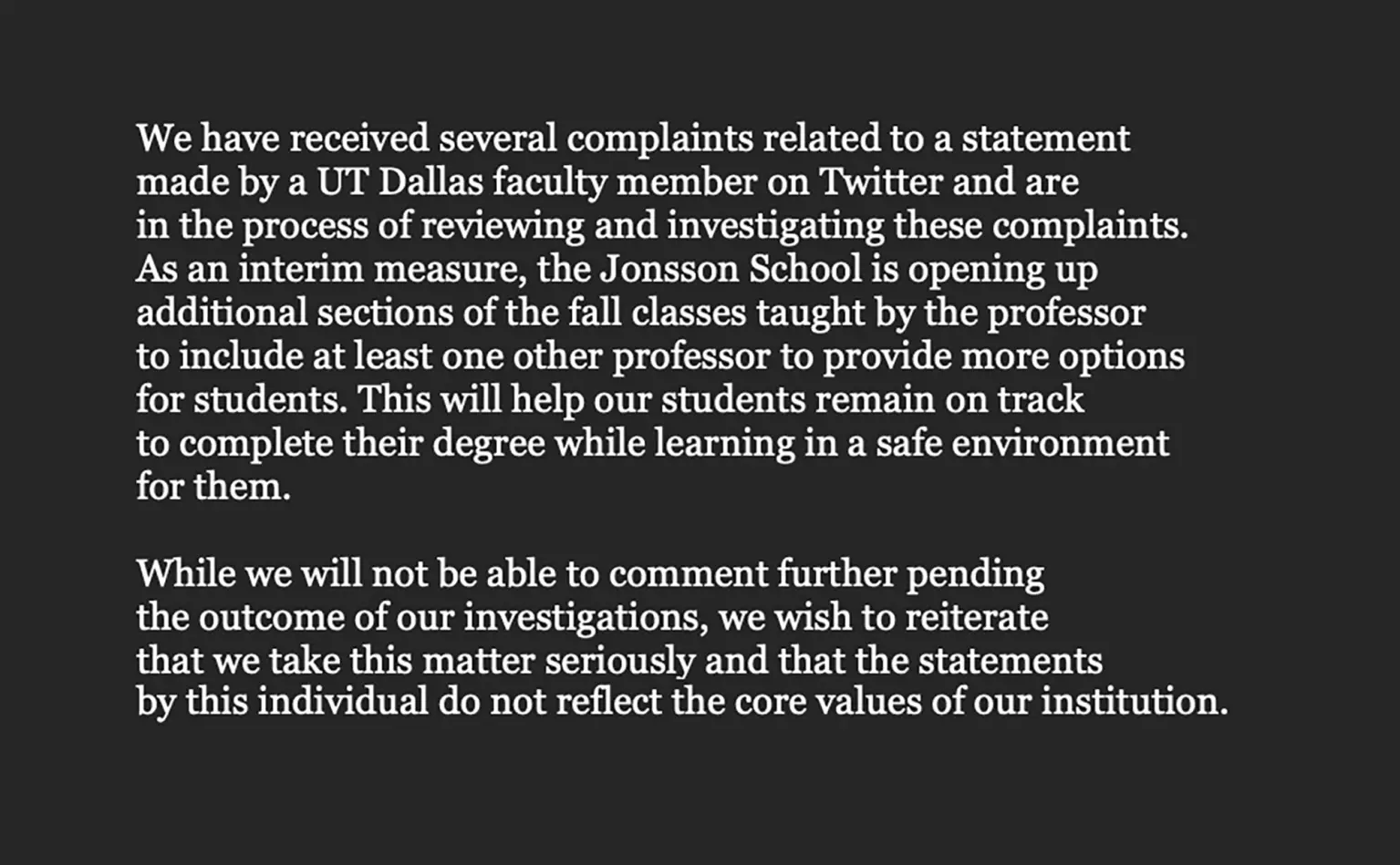 “We take this matter seriously and that the statements by this individual do not reflect the core values of our institution,” the university said in a statement.