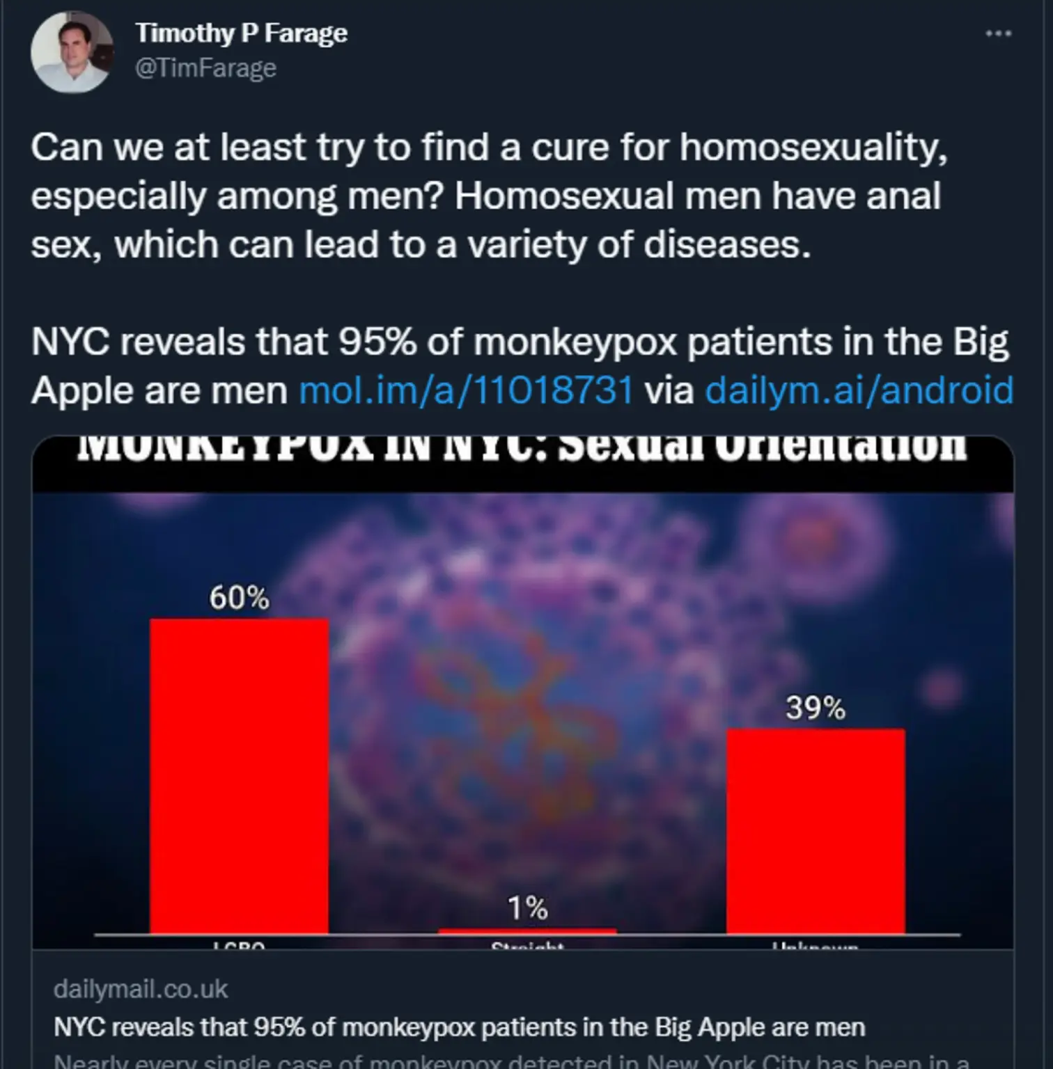 Professor Timothy Farage is under investigation by The University of Texas at Dallas after a tweet that made misleading claims about an alleged link to homosexuality and monkeypox.