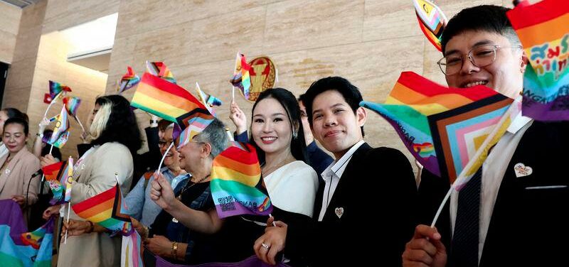 Lawmakers and activists were seen celebrating in Thailand’s parliament, waving rainbow flags and smiling, with some raising their fists in solidarity with the LGBT community.