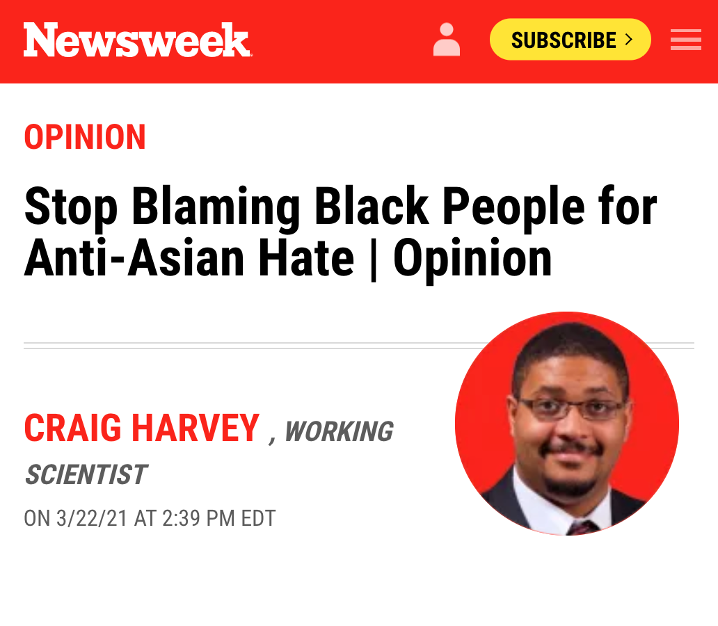 Meanwhile, Newsweek on March 22 published an op-ed by one Craig Harvey, who is a “working scientist” (I don’t know what that is), claiming that black attacks on Asians are a blood libel.