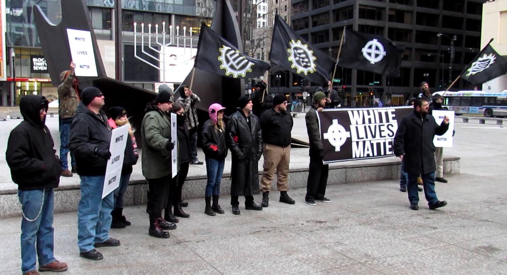 Chicago is the most dangerous city there is to do this in yet they were able to walk right up the giant menorah at city hall and emerge triumphant without any conflict at all, after chanting for National Socialism. Accusations of the use of chaos magick have been made by certain people who just want to tear down unity like this. The NSM, TRS and Soldiers of Odin were all there and this shows that it can be done, we are having an effect, we are reaching people and we are recruiting advocates for our race with our multi-media propaganda operations.