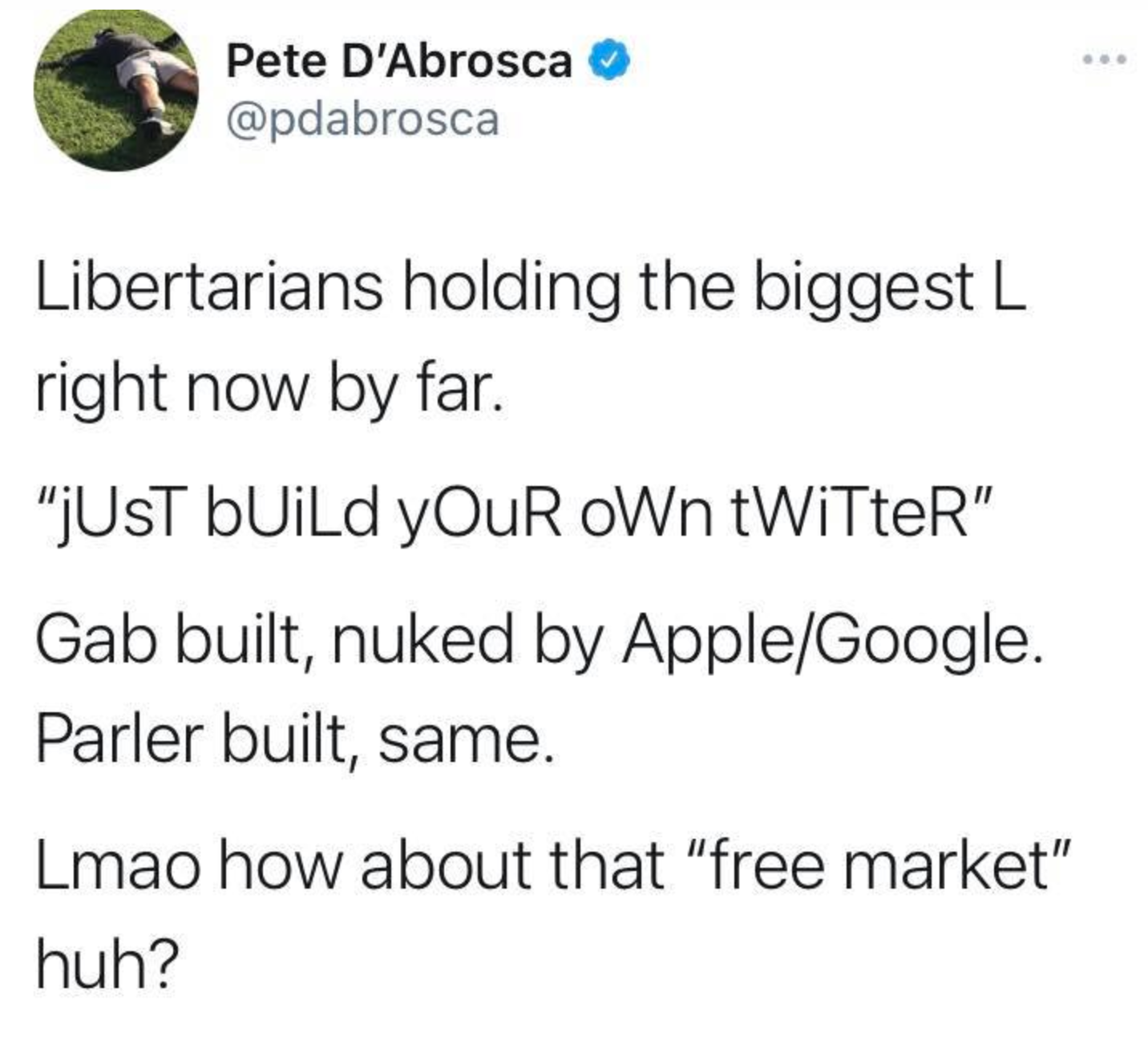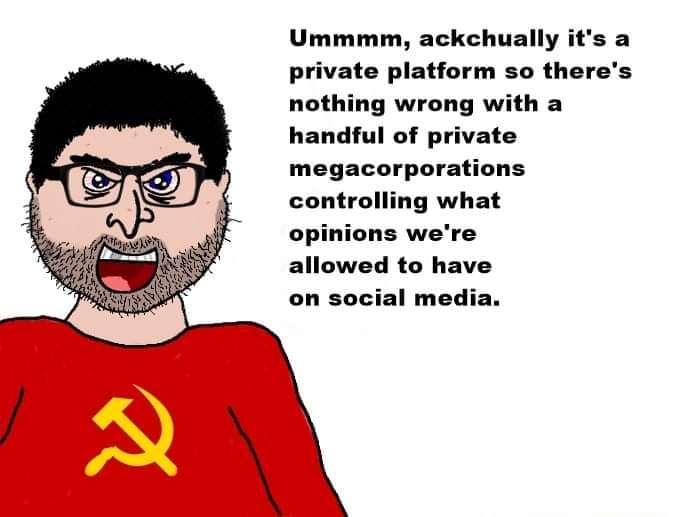 If we go back to the 18th century, this is like if there was an absolute monopoly on the production of paper and ink, and that monopoly could refuse to sell paper and ink to people whose political views they disagreed with. Then, if the political dissidents tried to make their own paper and ink, the monopoly forces came and burned down their factory, and the government says “they’re allowed to burn down your paper and ink factory because they’re a private company.”