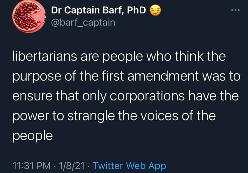 Libertarians are the single most useful group of idiots on the planet. They get none of the things they want, ever, unless those things happen to overlap with what the ruling oligarchy wants, such as “private companies should be allowed to do whatever they want to anyone.”