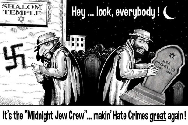 All bomb threats to synagogues are fake and done by the Jews. They also spray-paint weird-looking swastikas on their own buildings and attack their own graveyards. You know the old meme.