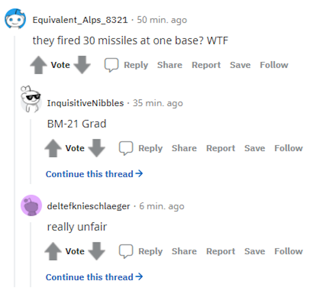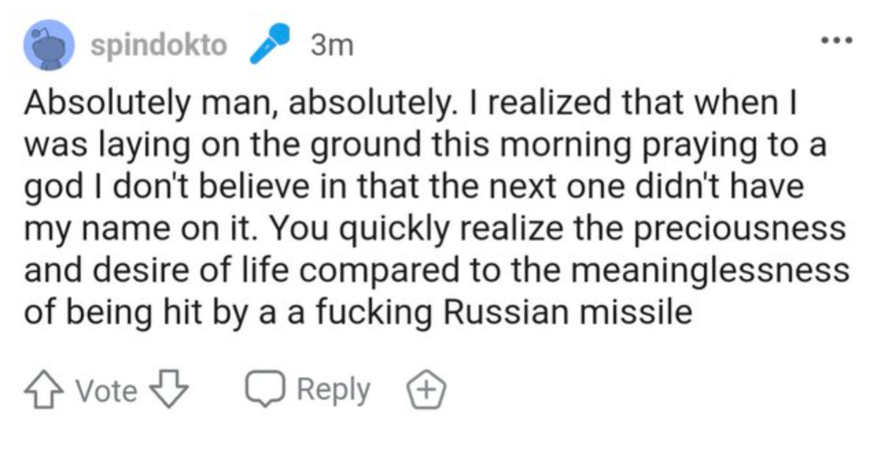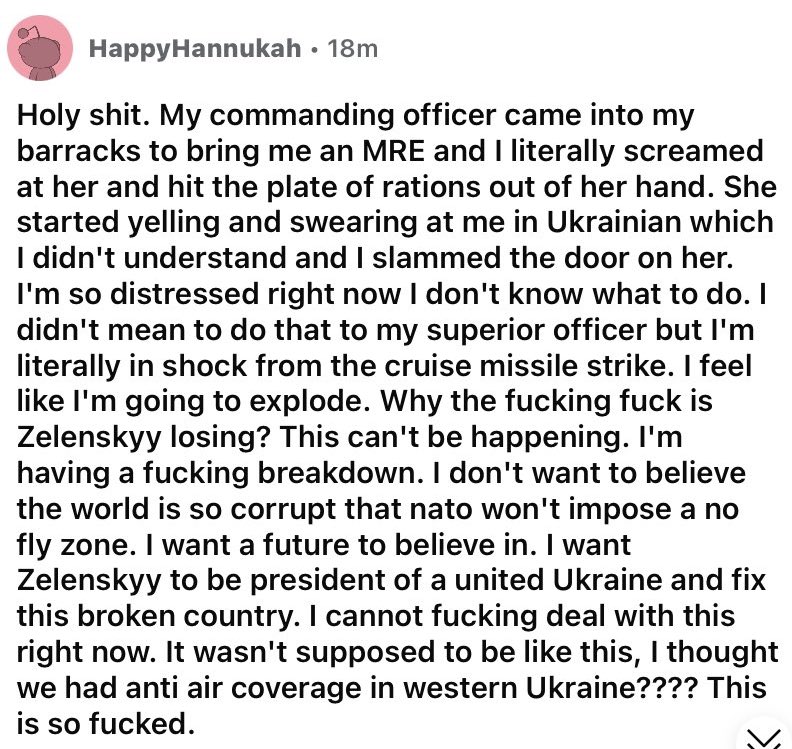 The punishment for desertion is summary execution, so the mods from r/VolunteersForUkraine need to hunt these deserters down and have them hanged. That’s their patriotic duty to the Reddit Rambo brigade.