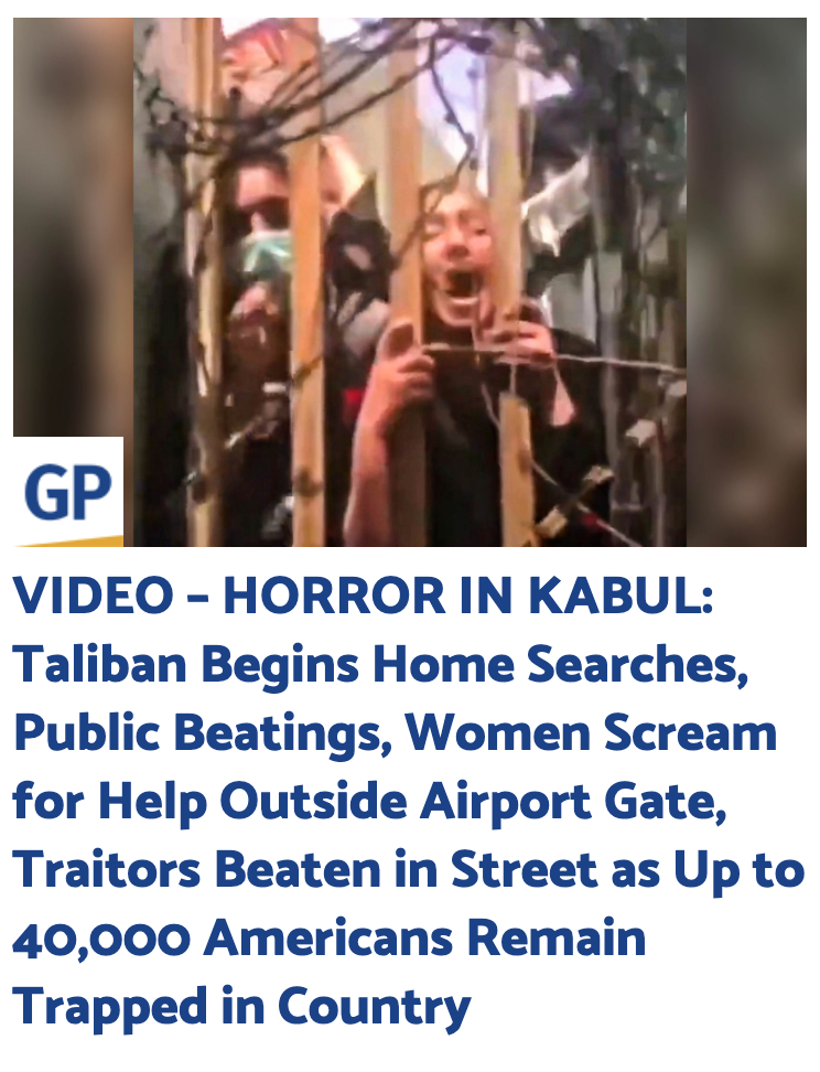 https://twitter.com/Blackseetornado/status/1427892055536189441?ref_src=twsrc%5Etfw%7Ctwcamp%5Etweetembed%7Ctwterm%5E1427892055536189441%7Ctwgr%5E%7Ctwcon%5Es1_&ref_url=https%3A%2F%2Fwww.thegatewaypundit.com%2F2021%2F08%2Fvideo-horror-kabul-taliban-begins-home-searches-public-beatings-women-scream-help-outside-airport-gate-traitors-beaten-street-40000-americans-remain-trapped-country%2F