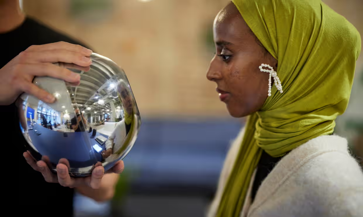 Hibaq Farah observing a shiny orb, paralyzed with confusion
