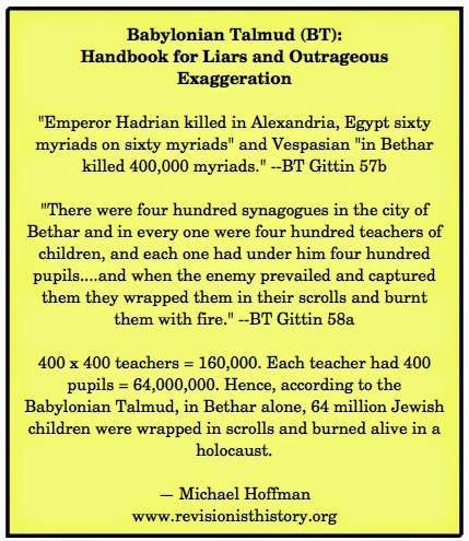 This bald moral deparavity is summed up in the oft-heard phrase in the American media, “Israel’s right to self-defense.” The idea that the Palestinians have the same right has never occurred to them. Palestinians are mere goyim. They are not the Talmudically certified Holy People who suffered the Holocaust of the 64 Million.