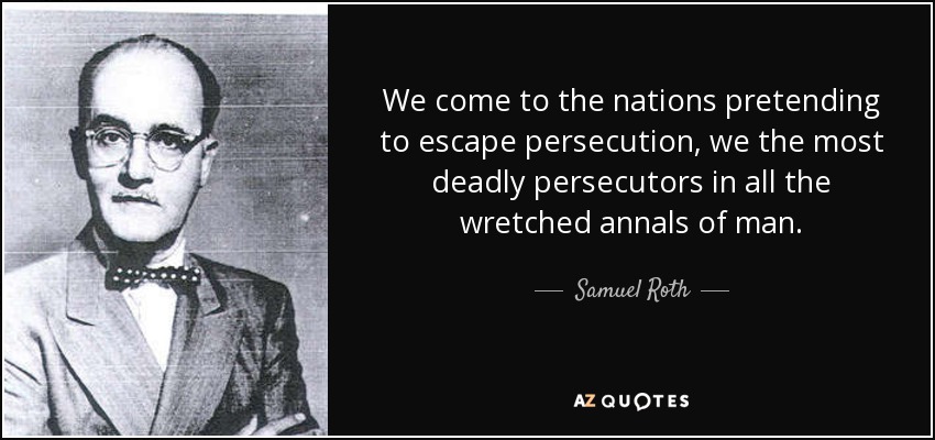 - Samuel Roth, Jews Must Live: An Account of the Persecution of the World by Israel on All the Frontiers of Civilization, 1934, p.177-178 footnote:“The next time you read about a particularly bloody pogrom and pause to wonder how Christians, dedicated to a religion of mercy, can exercise so much brutality against the Jews, remember that the Jew wheedles all the mercy out of his neighbors in the ordinary course of business. He lies and cheats until he is caught. When caught, instead of accepting punishment, he moans and tears his hair, invokes the sores of ancestors in their graves and living relations at the point of death in hospitals, until the wronged gentile, nauseated, lets him go. Then, thumbing his nose at the gentile behind his back, the Jew goes about his business the same way, lying and cheating now doubly to make up for lost time. A pogrom is usually the climax of years of such relentless goading. Do you wonder that when the final reckoning comes the gentile is absolutely merciless?”