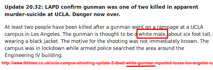 Firstly, the media actually did claim that this was a White male. They claimed it over and over and over again, until the guy’s picture was released, and even then they never issued any retraction or changed the old articles. You can still read “White male” on dozens of mainstream news sites.